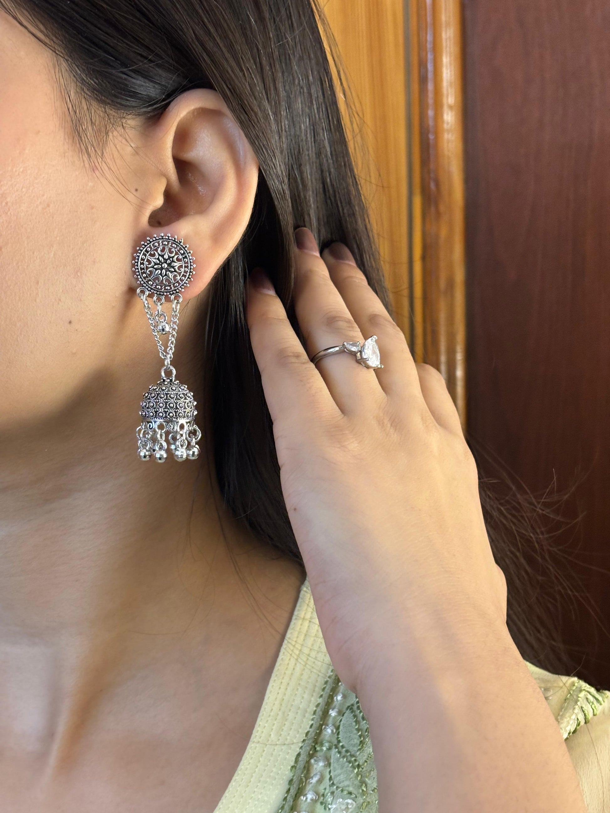 - Oxidised floral jhumka earrings β Flower-shaped stone stud complemented by intricate dome jhumka detailing.